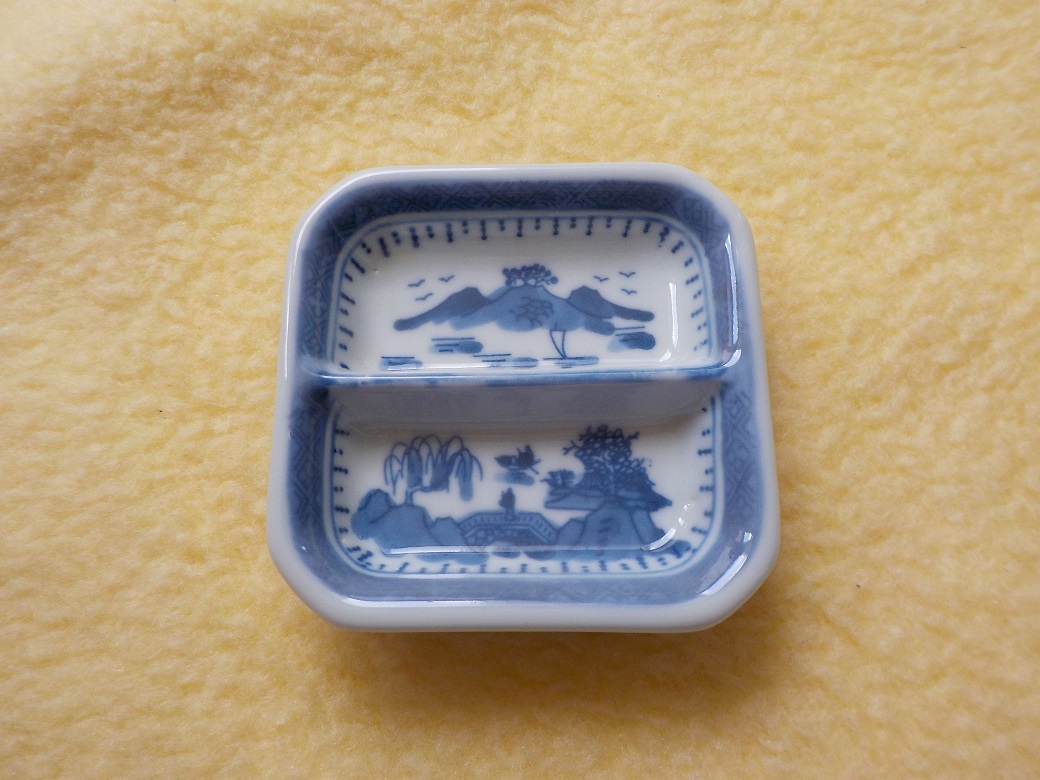 Čínský porcelán, motiv horské zahrady; výška 2 cm, šířka 9 cm, hloubka 9 cm